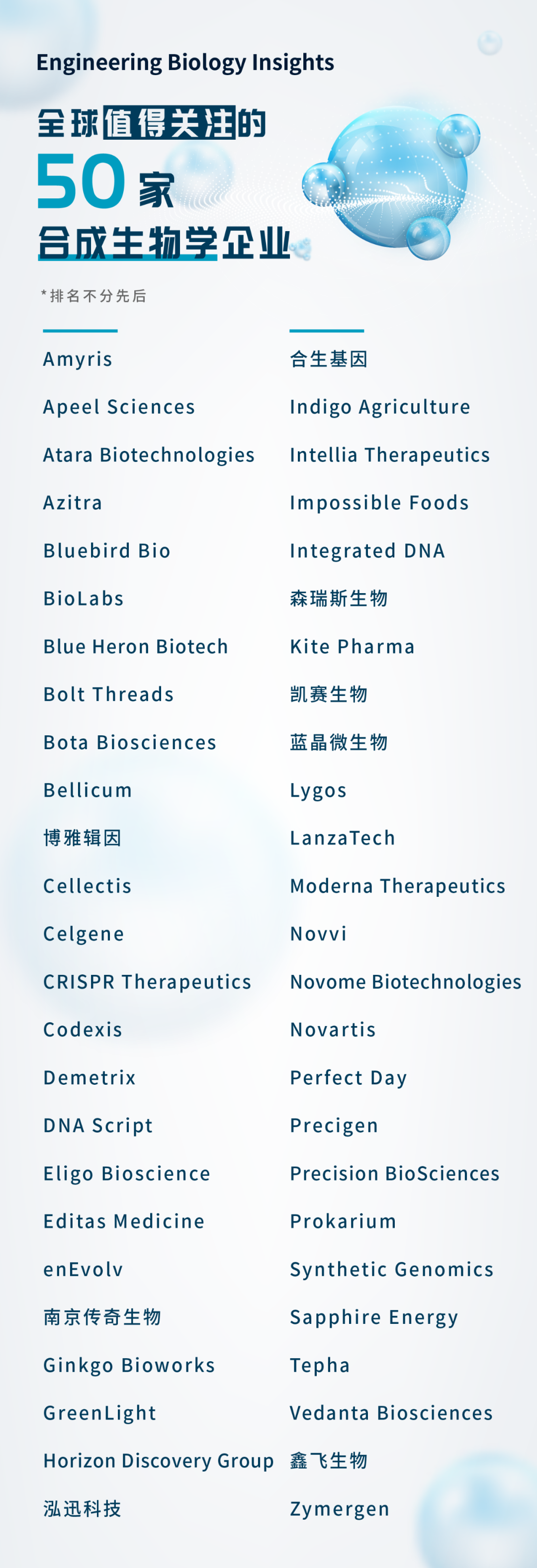 從 CB Insights 的統(tǒng)計(jì)數(shù)中不難發(fā)現(xiàn),從 2015 年開(kāi)始,大批合成生物學(xué)相關(guān)公司相繼成立。融資階段分布數(shù)據(jù)顯示,2015-2017 年,融資階段主要分為在種子 / 天使輪,3 年平均占比超 35%;而 2018 年至今,融資階段向 A 輪及 B 輪轉(zhuǎn)移,其中 2020 年 1-8 月,B 輪融資占比已達(dá) 33%。隨后,基于 EB Insights 的研究成果,劉炯在會(huì)上發(fā)布了 “全球最值得關(guān)注的 50 家合成生物學(xué)企業(yè)” 榜單,并重點(diǎn)介紹深耕中國(guó)本土市場(chǎng)的公司,在他們用 “上帝之手” 譜寫(xiě)生命奧秘的背后,變革的巨浪早已奔涌而至。立足中國(guó),為了實(shí)現(xiàn)可持續(xù)性發(fā)展,合成生物學(xué)可以獲得能源、化學(xué)等方面的可持續(xù)產(chǎn)品,也能減少環(huán)境污染。而且更重要的是,合成生物學(xué)是一門(mén)新興學(xué)科,雖然目前中國(guó)的生物技術(shù)整體而言還趕不上發(fā)達(dá)國(guó)家,但是對(duì)于早期階段起步的合成生物學(xué),中國(guó)也許能成為這一具有極大潛力的研究領(lǐng)域的主要參與者。以下為榜單中的中國(guó)公司介紹,排名不分先后:關(guān)鍵詞:全球頂尖合成生物學(xué)產(chǎn)業(yè)團(tuán)隊(duì),構(gòu)建計(jì)算驅(qū)動(dòng)的生物鑄造廠上榜理由:Bota Biosciences 成立于美國(guó)劍橋,以計(jì)算為基礎(chǔ)搭建酶工程、菌株工程和發(fā)酵工藝工程平臺(tái),涵蓋酶催化、生物轉(zhuǎn)化和生物全合成三大技術(shù)路徑,通過(guò)由云端遠(yuǎn)程操控和自動(dòng)化設(shè)施組成的云端實(shí)驗(yàn)室,可實(shí)現(xiàn)每年 1,000,000+ 通量的菌株構(gòu)建實(shí)驗(yàn)操作、測(cè)試和數(shù)據(jù)收集,為化?、?品、農(nóng)業(yè)和制藥等行業(yè)提供創(chuàng)新產(chǎn)品研發(fā)與大規(guī)模生產(chǎn)解決方案。團(tuán)隊(duì)成員在合成生物學(xué)領(lǐng)域具有多個(gè)產(chǎn)品的成功工業(yè)化經(jīng)驗(yàn)。 關(guān)鍵詞:國(guó)內(nèi)首個(gè) CRISPR 基因編輯療法臨床試驗(yàn)申請(qǐng)?zhí)峤?/strong>上榜理由:基于獲獎(jiǎng)技術(shù) CRISPR 為多種遺傳疾病和癌癥加速藥物研究以及開(kāi)發(fā)創(chuàng)新療法 。今年,該公司宣布中國(guó)國(guó)家藥品監(jiān)督管理局藥品審評(píng)中心(CDE)已經(jīng)受理其針對(duì)輸血依賴型 β 地中海貧血的基因編輯療法產(chǎn)品 ET-01 的臨床試驗(yàn)申請(qǐng),這是國(guó)內(nèi)首個(gè) CRISPR 基因編輯療法臨床試驗(yàn)申請(qǐng)?zhí)峤?。ET-01 的通用名為 “CRISPR/Cas9 基因修飾 BCL11A 紅系增強(qiáng)子的自體 CD34+ 造血干祖細(xì)胞注射液”,通過(guò)對(duì)造血干細(xì)胞的合成改造,解決輸血依賴型 β 地中海貧血患者的患病痛苦。關(guān)鍵詞:全球首次利用合成生物學(xué)技術(shù)優(yōu)化、改造的免疫療法用于治療中晚期腫瘤病人上榜理由:中國(guó)首家致力于合成生物技術(shù)在生物醫(yī)藥領(lǐng)域應(yīng)用的高新技術(shù)公司,2020 年 11 月 27 日,基于國(guó)內(nèi)原創(chuàng)的合成生物技術(shù)開(kāi)發(fā)的首款基因治療產(chǎn)品 SynOV1.1 獲得美國(guó) FDA 臨床試驗(yàn)許可,用于治療包括中晚期肝癌在內(nèi)的甲胎蛋白(AFP)陽(yáng)性實(shí)體瘤,并計(jì)劃近期在美國(guó)紀(jì)念斯隆?凱特琳癌癥中心(Memorial Sloan Kettering Cancer Center)開(kāi)展 I/IIa 期臨床研究。這款藥物在中國(guó)的臨床試驗(yàn)申請(qǐng)亦正在進(jìn)行中。將全球第一次將經(jīng)過(guò)合成生物學(xué)技術(shù)優(yōu)化、改造的免疫療法用于治療中晚期腫瘤病人。關(guān)鍵詞:讓 DNA 技術(shù)和應(yīng)用更好地服務(wù)生活上榜理由:團(tuán)隊(duì)累計(jì)具有近 50 年的合成生物學(xué)行業(yè)經(jīng)驗(yàn)。目前公司開(kāi)發(fā)的技術(shù)平臺(tái)為全球領(lǐng)先的合成生物學(xué)完整的 DNA 合成組合平臺(tái) ——Syno®1.0,Syno®2.0 和 Syno®3.0,可以高效應(yīng)用于人源化抗體庫(kù)構(gòu)建、基因工程疫苗開(kāi)發(fā)、工業(yè)酶優(yōu)化、染色體 / 基因組的合成、分子輔助育種以及 DNA 信息存儲(chǔ)的技術(shù)開(kāi)發(fā)。目前,泓迅科技以 Syno® 合成技術(shù)平臺(tái)為基礎(chǔ)進(jìn)一步設(shè)計(jì)和開(kāi)發(fā)出先進(jìn)的生物技術(shù)轉(zhuǎn)化及應(yīng)用平臺(tái) —— 泓迅 “GPS” 平臺(tái),該平臺(tái)依據(jù)生物學(xué)最核心的中心法則,在基因型 (Genotype)、表型(Phenotype)基礎(chǔ)上引入了人工合成型(Synotype),利用 “設(shè)計(jì)”、“創(chuàng)建”、 “應(yīng)用” 結(jié)合的方式解讀基因。關(guān)鍵詞:“合成生物學(xué)第一股”上榜理由:被稱為 “合成生物學(xué)第一股” 的凱賽生物主打 “生物法長(zhǎng)鏈二元酸” 系列產(chǎn)品,長(zhǎng)鏈二元酸生產(chǎn)基地于 2003 年實(shí)現(xiàn)產(chǎn)業(yè)化,目前年產(chǎn)能為 40,000 噸,是該產(chǎn)品的全球最大供應(yīng)商。此外,凱賽生物已經(jīng)與杜邦、艾曼斯、贏創(chuàng)、諾和諾德等國(guó)際知名企業(yè)建立起了客戶關(guān)系,其中杜邦(Dupont)近三年以來(lái)都是第一大客戶,高性能尼龍瑞士公司艾曼斯(EMS)是其第二大客戶。2019 年,境外營(yíng)收占比為 54.44%,境內(nèi)營(yíng)收的比例則為 45.56%。關(guān)鍵詞:PHA 生產(ch
