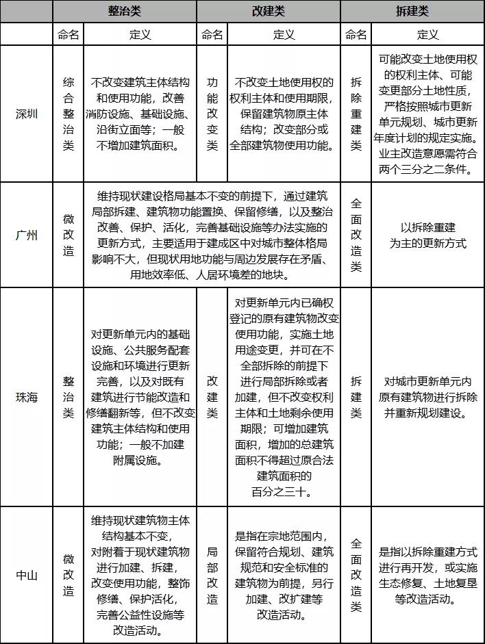 按照改造力度由弱到強,城市更新項目可分為整治類、改建類和拆建類三種類型。不同城市命名略有不同,但實質相近,例如深圳將城市更新項目分為綜合整治類、功能改變類和拆除重建類(分別對應整治、改建和拆建);廣州分為全面改造(對應拆建)和微改造(對應整治和改建);中山分為微改造、局部改造和全面改造(分別對應整治、改建和拆建)。