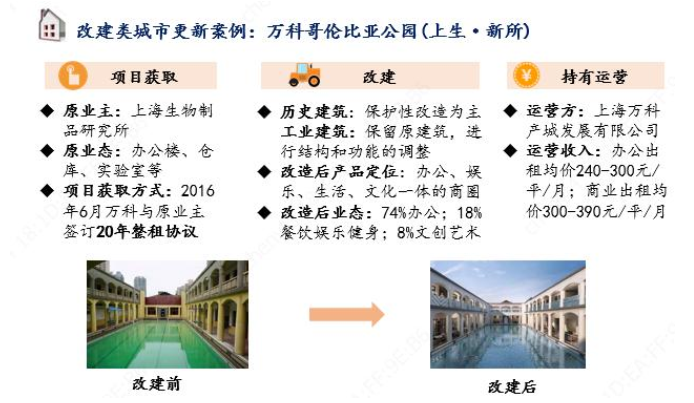 改建類項目改造力度居中、一般需由市級城市更新管理部門審批,房企一般可通過改造、持有運營的等方式參與項目。改建類項目一般不改變土地使用權的權力主體和使用期限,在不全部拆除的前提下進行局部拆除或加建,可實施土地用途變更,部分城市可增加建筑面積(但一般會對建筑面積增幅設限,例如珠海要求不超過30%)。房企可通過改造、持有運營等方式參與項目,代表案例如萬科上海哥倫比亞公園。