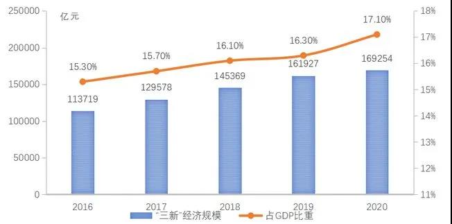 2016-2020年“三新”經(jīng)濟(jì)規(guī)模及占GDP比重