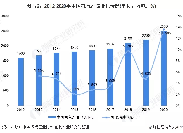 經(jīng)過十余年的長足發(fā)展,我國氫氣年產(chǎn)量已逾千萬噸規(guī)模,位居世界第一大產(chǎn)氫國。據(jù)中國煤炭工業(yè)協(xié)會(huì)數(shù)據(jù)統(tǒng)計(jì),2012-2020年,中國氫氣產(chǎn)量整體呈穩(wěn)步增長趨勢。其中2019年-2020年,同比增速最為顯著,達(dá)到13.6%,且2020年,中國氫氣產(chǎn)量超過2500萬噸。