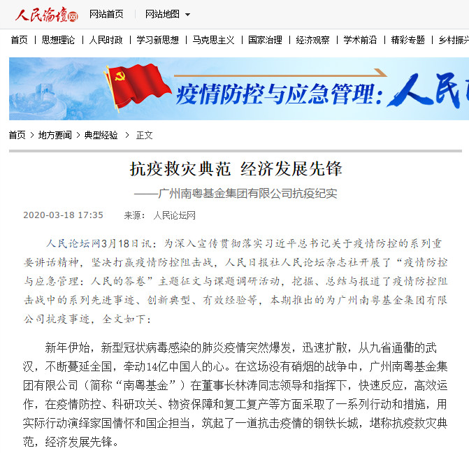 3月18日,人民日?qǐng)?bào)社人民論壇雜志社開展了“疫情防控與應(yīng)急管理:人民的答卷”主題征文與課題調(diào)研活動(dòng),以《抗疫救災(zāi)典范 經(jīng)濟(jì)發(fā)展先鋒》為題,全面、系統(tǒng)地總結(jié)報(bào)道了南粵基金在疫情防控阻擊戰(zhàn)中的先進(jìn)事跡、創(chuàng)新典型和有效經(jīng)驗(yàn)。