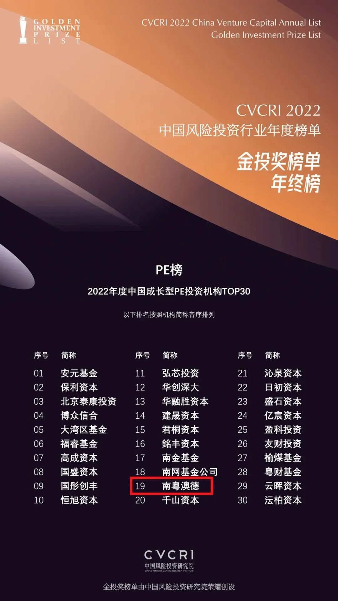 1月10日,中國風(fēng)險投資研究院發(fā)布“2022中國風(fēng)險投資行業(yè)年度榜單?金投獎”榜單,南粵基金旗下股權(quán)投資平臺——廣州南粵澳德股權(quán)投資基金管理有限公司(簡稱“南粵澳德”)憑借專業(yè)的投資能力和優(yōu)秀的投資業(yè)績,榮獲“2022年度中國成長型PE投資機(jī)構(gòu)TOP30”,一并入選的還有南網(wǎng)基金公司、大灣區(qū)基金、粵財基金等知名機(jī)構(gòu)。