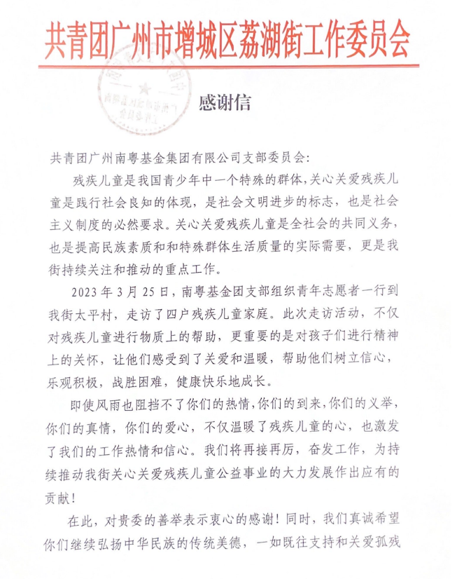 南粵基金還組織青年志愿者一行10余人來到增城區(qū)荔湖街太平村,走訪慰問了四戶殘疾兒童家庭。青年志愿者們與家長談心、拉家常,深入詢問兒童的身體情況和家庭狀況,鼓勵孩子要保持堅強和樂觀心態(tài),增強戰(zhàn)勝困難的信心和勇氣,努力做陽光樂觀的新時代好少年。
