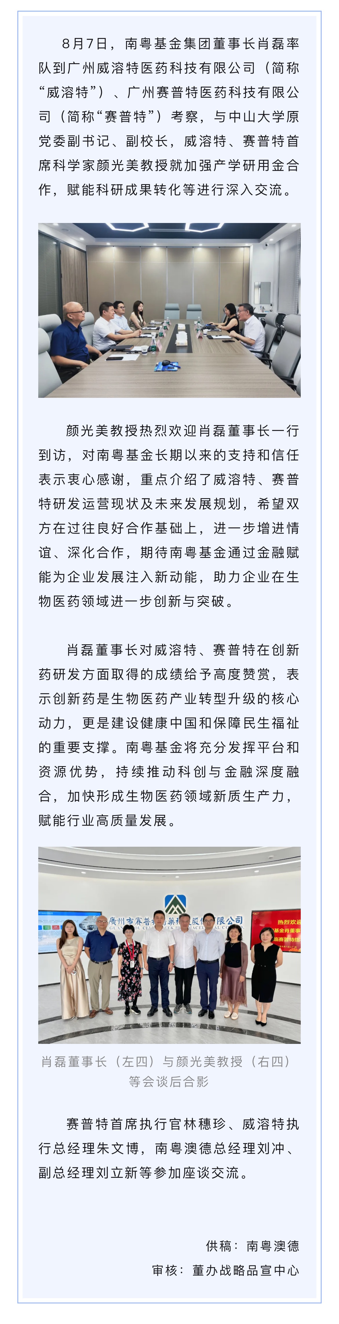 南粵基金董事長肖磊考察生物醫(yī)藥企業(yè)威溶特、賽普特