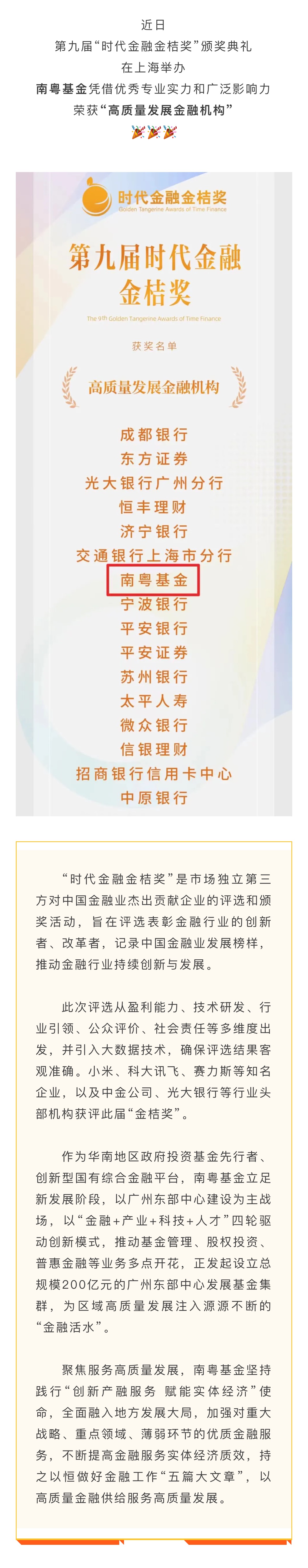 時代“金桔獎”揭曉 南粵基金榮獲“高質量發(fā)展金融機構”