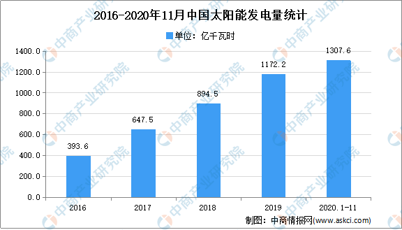 太陽能是一種可再生能源,指太陽的熱輻射能,主要表現(xiàn)就是常說的太陽光線,一般用作發(fā)電或者為熱水器提供能源。太陽能的利用有光熱轉(zhuǎn)換和光電轉(zhuǎn)換兩種方式,目前,太陽能光伏發(fā)電系統(tǒng)是主要的應(yīng)用。近年來,我國太陽能發(fā)電量持續(xù)提高。數(shù)據(jù)顯示,2019年我國太陽能發(fā)電量為1172.2億千瓦時。2020年1-11月我國太陽能發(fā)電量累計達(dá)1307.6億千瓦時,同比增長8.1%。