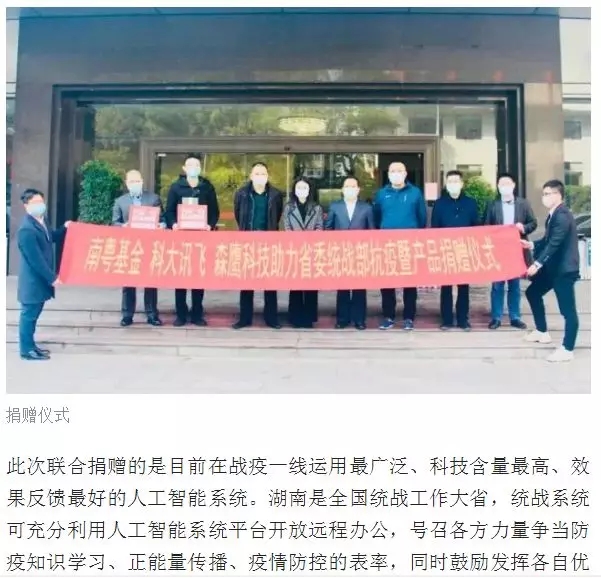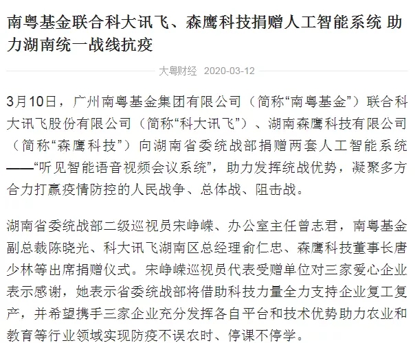 大粵財(cái)經(jīng)|南粵基金聯(lián)合科大訊飛、森鷹科技捐贈(zèng)人工智能系統(tǒng) 助力湖南統(tǒng)一戰(zhàn)線(xiàn)抗疫