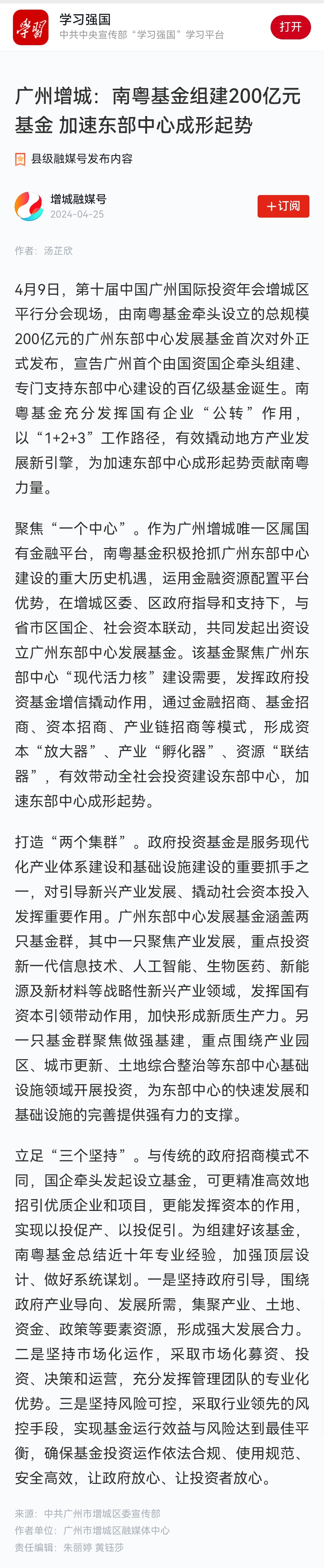 學(xué)習(xí)強(qiáng)國 | 廣州增城:南粵基金組建200億元基金 加速東部中心成形起勢