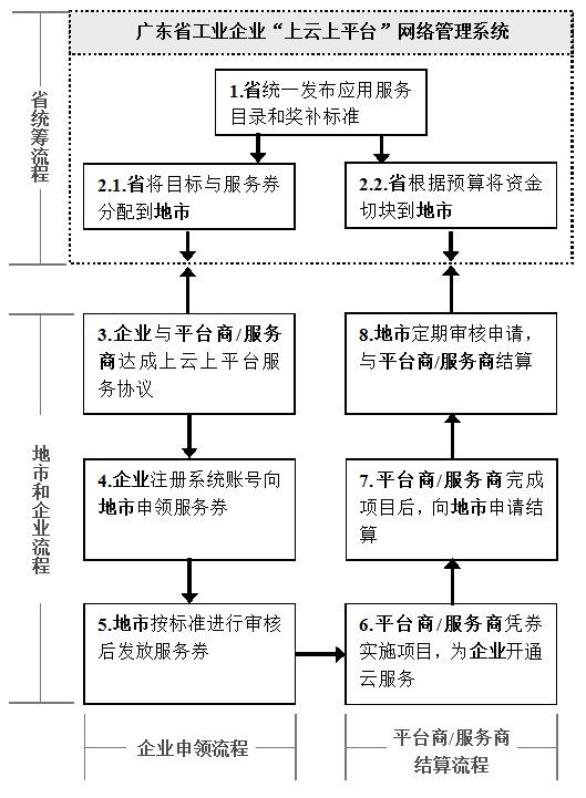 方式:財政資金支持。省財政采取服務(wù)券后補助方式,對工業(yè)企業(yè)“上云上平臺”費用按標(biāo)準(zhǔn)予以獎補(納入獎補的應(yīng)用服務(wù)目錄和獎補標(biāo)準(zhǔn)由省統(tǒng)一制定發(fā)布并按年度更新)。建設(shè)廣東省工業(yè)企業(yè)“上云上平臺”網(wǎng)絡(luò)管理系統(tǒng),統(tǒng)籌監(jiān)督管理服務(wù)券發(fā)放和資金結(jié)算。服務(wù)券獎補范圍包括應(yīng)用服務(wù)費、設(shè)備接入費、網(wǎng)絡(luò)改造費等,不包括企業(yè)購買自動化、智能化設(shè)備等費用。(省經(jīng)濟和信息化委、財政廳,各地級以上市人民政府)