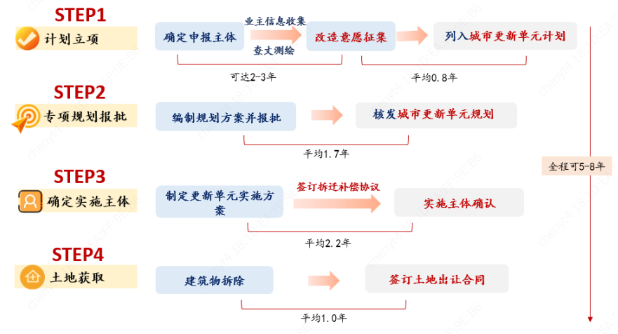 本部分重點討論房企參與較多的拆建類城市更新項目流程。拆建類城市更新項目分為四大步驟,(1)計劃立項、(2)專項規(guī)劃報批、(3)實施主體確認和(4)土地獲取,完成四個步驟耗時可達5-8年,流程越靠前項目不確定性越高。