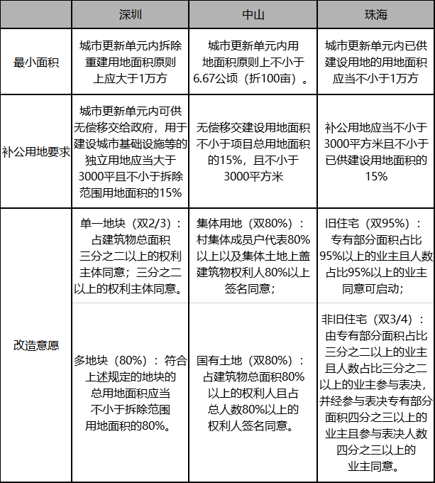 指項目申請納入“城市更新單元計劃”。申報主體可以為權利主體(如村委會等)、由權利主體委托的市場主體(如房企)、或市/區(qū)政府,項目申報需滿足一定前提,如達到最小改造規(guī)模、補公用地達到一定比重、改造意愿滿足條件等。其中,改造意愿征集是立項前的關鍵步驟,不同城市要求有所不同,如深圳為單地塊“雙2/3”,珠海為舊住宅“雙95%”,非舊住宅“雙3/4”。在完成意愿征集后,申報主體可向區(qū)更新辦提交申報材料,經區(qū)、市兩級審批后項目納入“城市更新單元計劃”,標志立項成功。