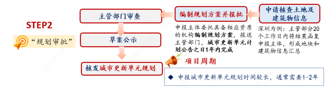 指“城市更新單元規(guī)劃”的編制和審批,通常需在立項公告后一定時限內完成方案報送,如深圳要求1年。在這一流程中,申報主體一般首先向主管部門申請核查土地及建筑物信息,再聘請有資質的規(guī)劃設計單位編制規(guī)劃方案,并與規(guī)劃國土部門深入溝通、報審,以獲得對公司有利的批復指標。專項規(guī)劃報批是房企就容積率、配建要求等與政府進行博弈的過程,通常需要耗時1-2年。