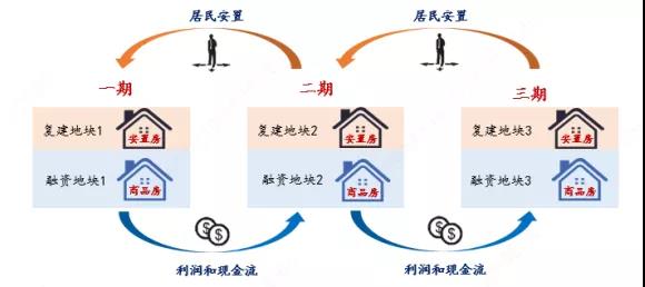 城市更新項目一般通過滾動開發(fā)模式平衡資金。部分安置、部分出售、分期投入、滾動開發(fā)是城市更新項目的基本思路。城市更新項目一般以安置區(qū)作為啟動,安置部分拆遷戶,剩余房產出售,產生利潤,滾動進入下一期的開發(fā)成本,可較好的緩解實施主體資金壓力。
