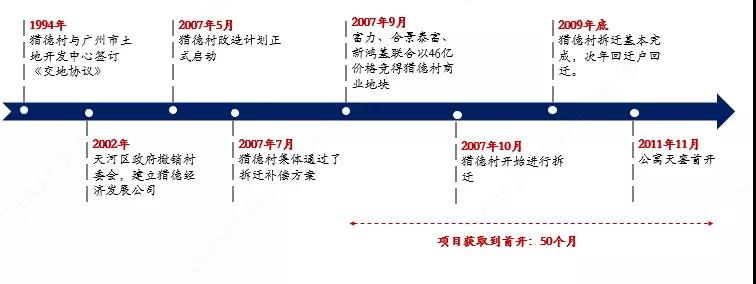 2007年9月,富力、合景泰富、新鴻基聯(lián)合以46億的價格競得獵德村西片區(qū)商業(yè)地塊,其中約25億用作拆遷款安置及新樓建設款,10億用于投資村南酒店。2007年10月獵德村開始進行拆遷,2009年底拆遷基本完成,2010年初回遷戶回遷至原村東片區(qū)。