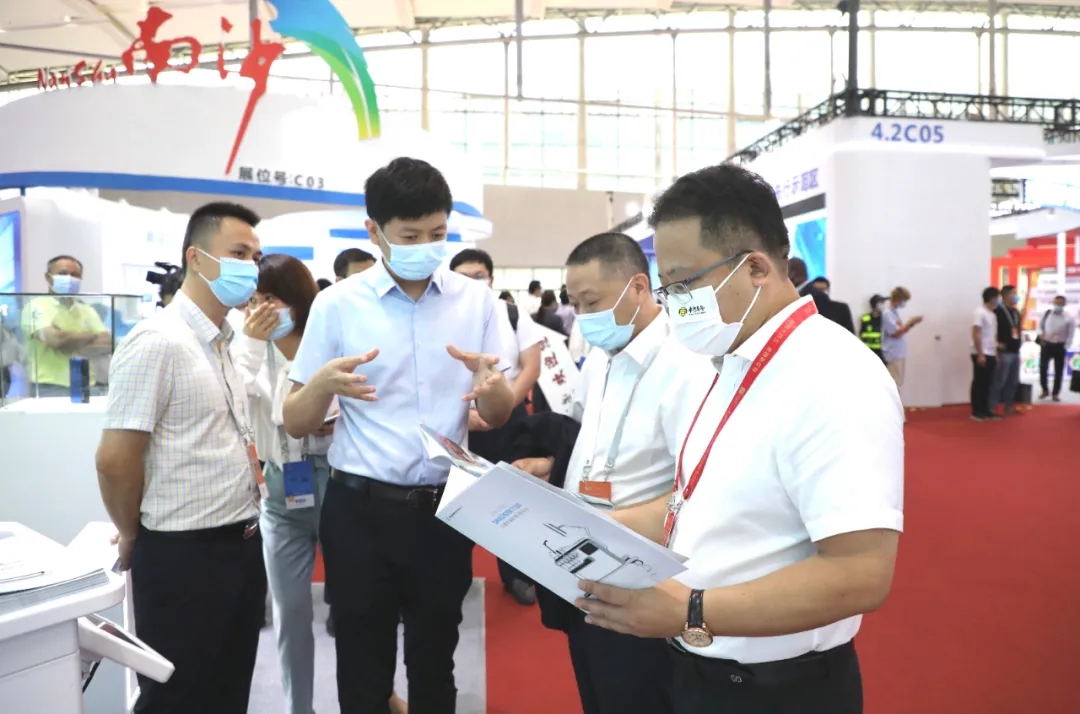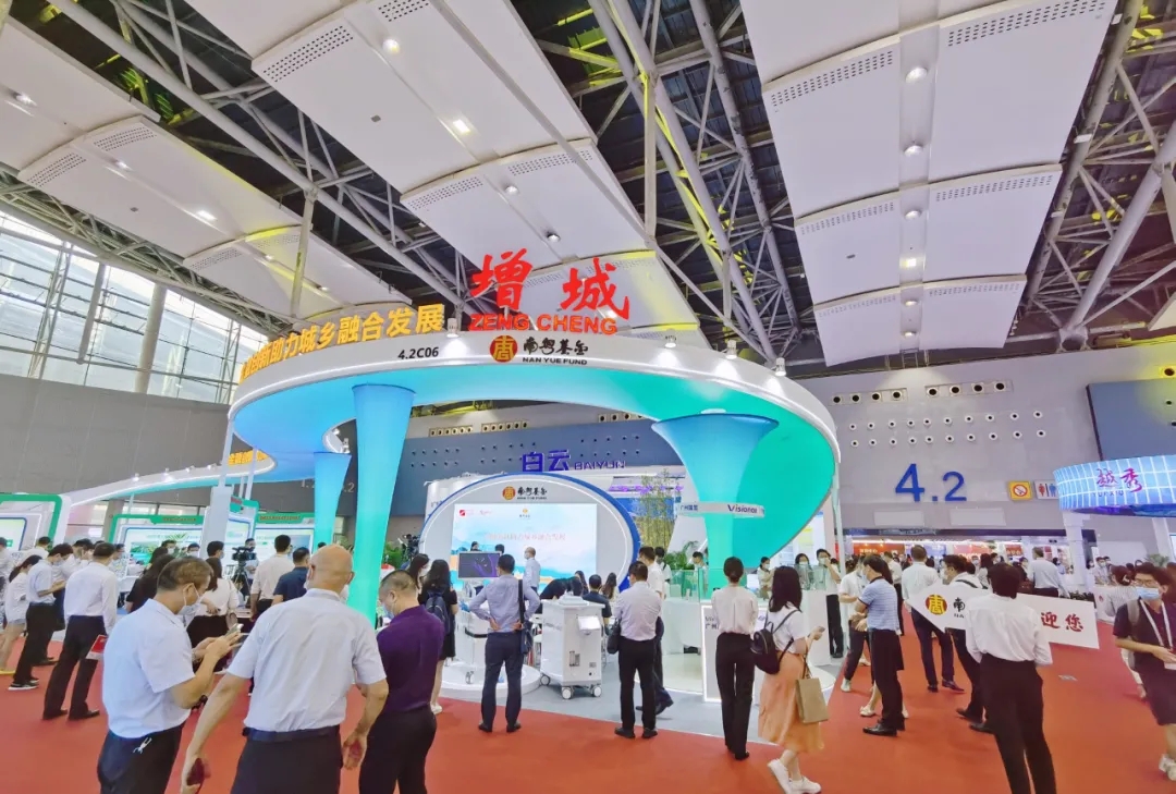增城區(qū)發(fā)展和改革局局長曾鴻斌(右二)、南粵基金董事長林濤(右一)現(xiàn)場聽取奇點醫(yī)療有關(guān)情況介紹