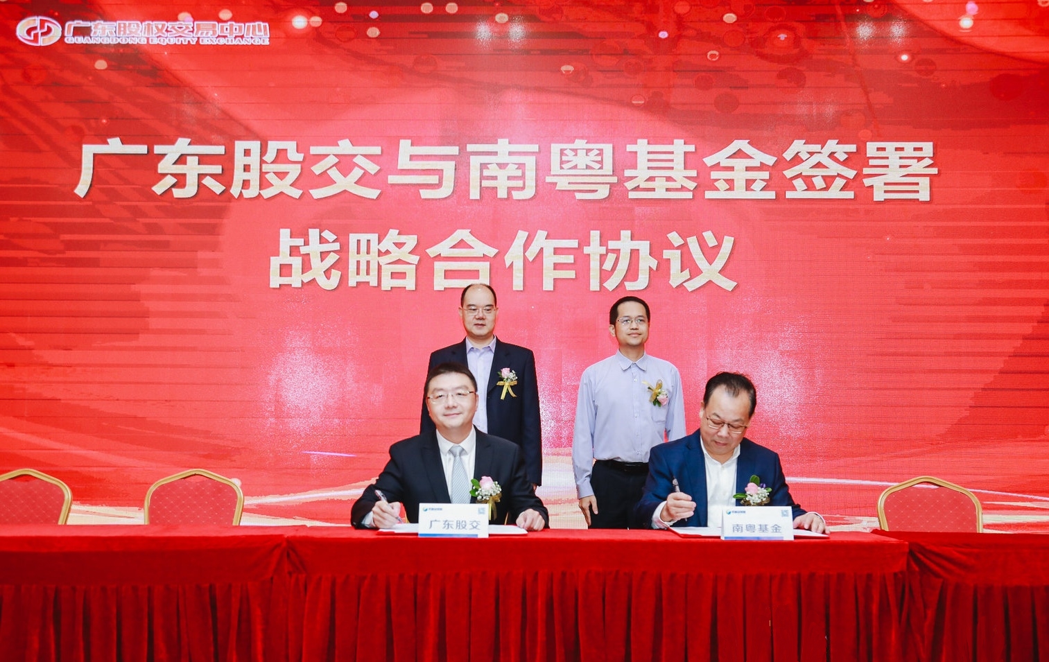在許松輝副局長(后排右)、曾金賢總裁(后排左)見證下,廣東股交副總經(jīng)理李潤才(前排左)與陳曉光副總裁代表雙方簽約