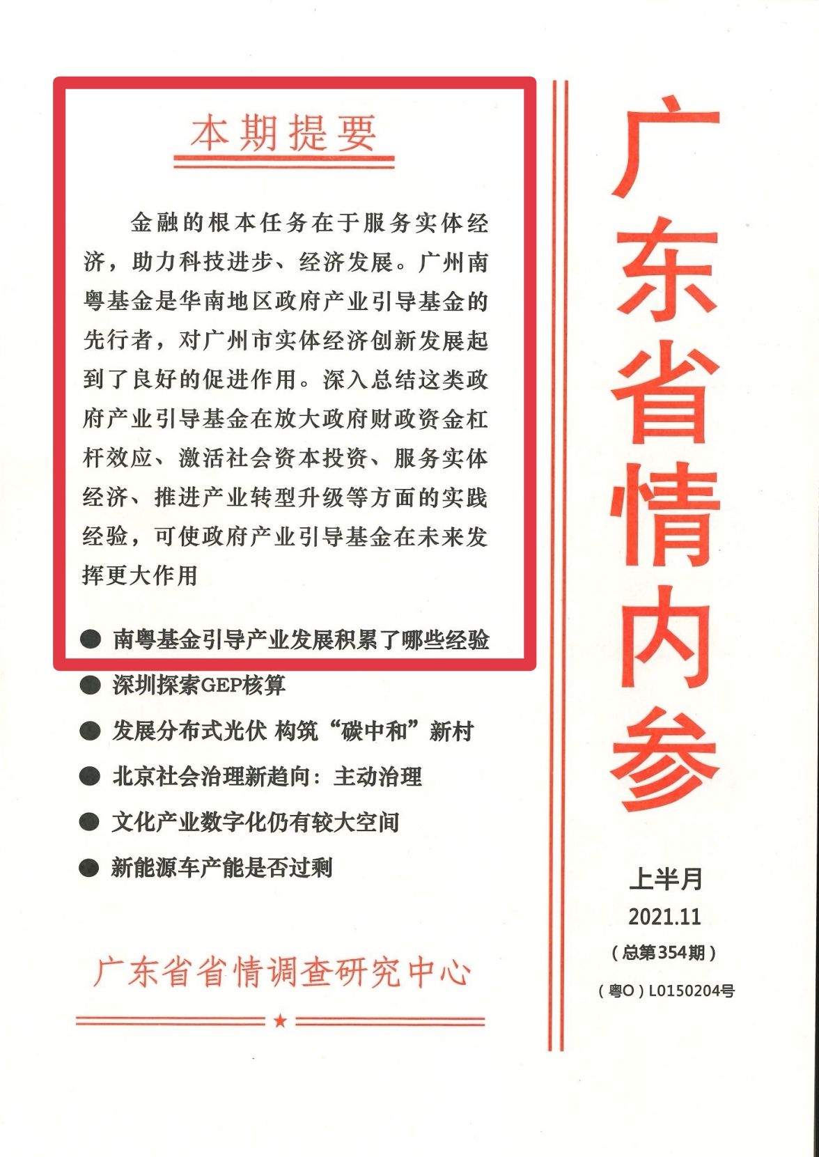 《廣東省情內(nèi)參》由廣東省省情調(diào)查研究中心主辦,是廣東省廳(局)級以上黨政領(lǐng)導(dǎo)干部以及從事省情研究的高級專家、學(xué)者的內(nèi)部參考資料?!秲?nèi)參》緊密圍繞省委、省政府的戰(zhàn)略部署和中心工作,在廣泛采集、客觀反映我省在經(jīng)濟社會發(fā)展中的熱點、難點、焦點問題的同時,充分發(fā)揮“智囊團”、“思想庫”的優(yōu)勢,強化對省情、輿情的綜合歸納及深度的研判,并提出合理化的解決思路和對策。