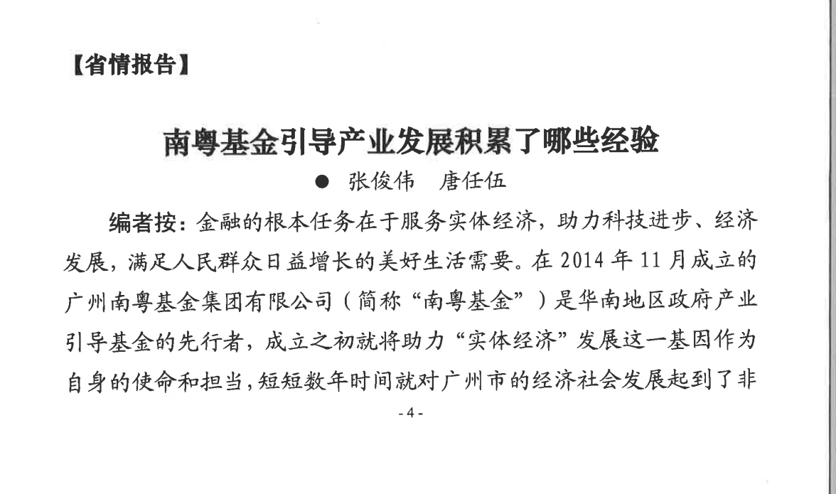 近日,《內(nèi)參》(總第354期)刊發(fā)了專題報告《南粵基金引導(dǎo)產(chǎn)業(yè)發(fā)展積累了哪些經(jīng)驗》,系統(tǒng)總結(jié)了南粵基金在放大政府財政資金杠桿效應(yīng)、激活社會資本投資、服務(wù)實體經(jīng)濟、推進產(chǎn)業(yè)轉(zhuǎn)型升級等方面的實踐經(jīng)驗。以下為報告全文: