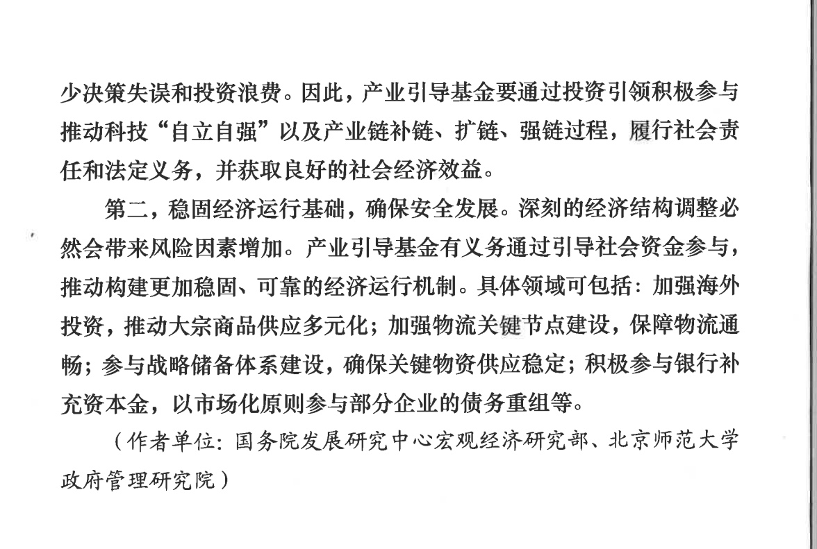 第二,穩(wěn)固經(jīng)濟運行基礎(chǔ),確保安全發(fā)展。深刻的經(jīng)濟結(jié)構(gòu)調(diào)整必然會帶來風(fēng)險因素增加。產(chǎn)業(yè)引導(dǎo)基金有義務(wù)通過引導(dǎo)社會資金參與,推動構(gòu)建更加穩(wěn)固、可靠的經(jīng)濟運行機制。具體領(lǐng)域可包括:加強海外投資,推動大宗商品供應(yīng)多元化;加強物流關(guān)鍵節(jié)點建設(shè),保障物流通暢;參與戰(zhàn)略儲備體系建設(shè),確保關(guān)鍵物資供應(yīng)穩(wěn)定;積極參與銀行補充資本金,以市場化原則參與部分企業(yè)的債務(wù)重組等。