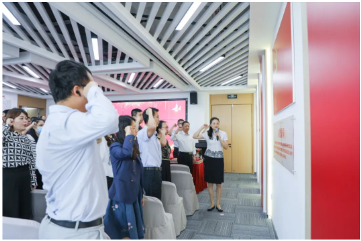 活動在莊嚴(yán)的國歌聲中拉開帷幕。隨后,陳一敏副主席帶領(lǐng)全體黨員在黨旗前莊嚴(yán)宣誓,重溫入黨誓詞。一聲聲鏗鏘有力的宣誓響徹會場,激勵著在場的每一位黨員,表達(dá)了對黨、對祖國和對人民的無限忠誠。