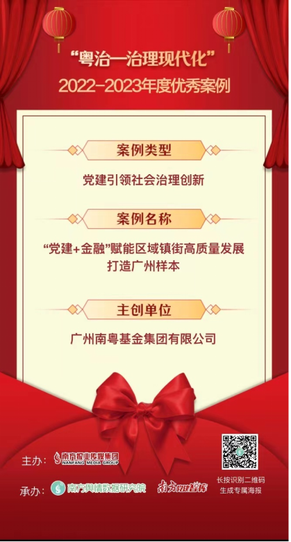 頒獎(jiǎng)推介詞這樣評(píng)價(jià)南粵基金黨建創(chuàng)新案例:“國(guó)企黨建如何助推區(qū)域高質(zhì)量發(fā)展,助力‘百千萬(wàn)工程’在基層落深落細(xì)落實(shí)?南粵基金通過(guò)建立黨員先鋒隊(duì)、制定黨建共建協(xié)議等方式摸準(zhǔn)鎮(zhèn)街的金融發(fā)展需求,提供區(qū)域個(gè)性化金融服務(wù)?!h建+金融’,成功做實(shí)‘金融服務(wù)進(jìn)鎮(zhèn)街’,既為更好承擔(dān)、落實(shí)國(guó)企的政治責(zé)任、社會(huì)責(zé)任探索了獨(dú)具金融企業(yè)特色的國(guó)企黨建路子,又找到了賦能區(qū)域鎮(zhèn)街經(jīng)濟(jì)發(fā)展的好辦法?!?