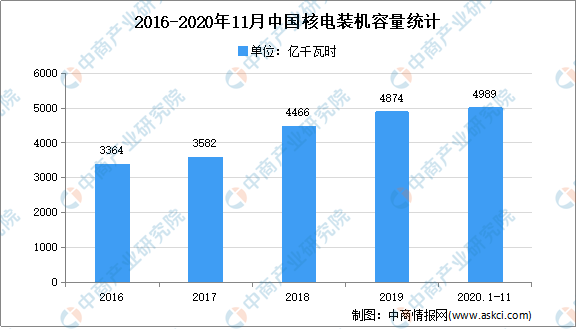 我國是世界上少數(shù)擁有比較完整核工業(yè)體系的國家之一,一直有序、積極的推進核電的應(yīng)用。從核電裝機容量來看,近年來保持向好的趨勢,2018年核電裝機量突破4000萬千瓦。數(shù)據(jù)顯示,2020年1-11月,我國核電裝機容量為4989萬千瓦,同比增長2.4%;全國核電發(fā)電量3310億千瓦時,同比增長5%。