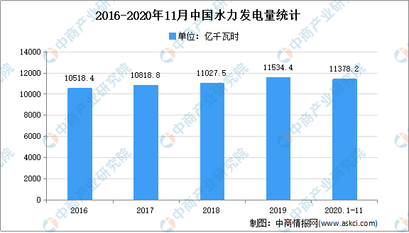 水能是一種清潔能源,指水體的動能、勢能和壓力能等能量資源。水能是一種可再生能源,主要用于水力發(fā)電。我國具有豐富的水力資源,水力發(fā)電是主要電力來源之一。數(shù)據(jù)顯示,2019年我國水力發(fā)電量為11534.4億千瓦時。2020年1-11月我國水力發(fā)電量累計達(dá)11378.2億千瓦時,同比增長4.9%。