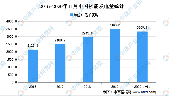 核能(或稱原子能)是通過轉(zhuǎn)化其質(zhì)量從原子核釋放的能量。核能是清潔能源,目前我國已建有秦山核電站、大亞灣核電站、嶺澳核電站等核電站,運行情況良好。數(shù)據(jù)顯示,2019年我國核能發(fā)電量為3483.5億千瓦時。2020年1-11月全國核能發(fā)電量為3309.7億千瓦時,同比增長5%。
