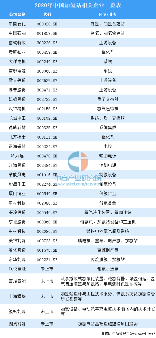 2020年中國加氫站相關(guān)企業(yè)一覽表