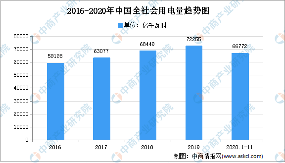 2020年,第一產(chǎn)業(yè)和城鄉(xiāng)居民生活用電保持較快增長,數(shù)據(jù)顯示,2020年1-11月,全國全社會用電量66772億千瓦時,同比增長2.5%,其中,11月份全國全社會用電量6467億千瓦時,同比增長9.4%。