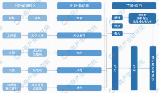 新能源產(chǎn)業(yè)鏈主要由上游的能源轉(zhuǎn)化,中游的新能源和下游的應(yīng)用構(gòu)成。