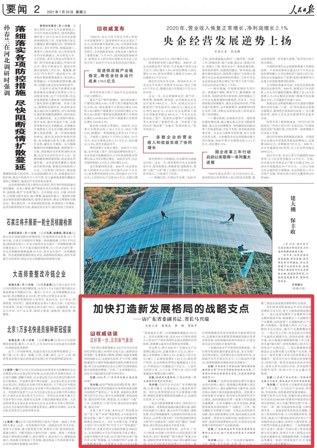 “我們將認(rèn)真貫徹落實(shí)習(xí)近平總書記在深圳經(jīng)濟(jì)特區(qū)建立40周年慶祝大會(huì)上重要講話和考察廣東重要指示精神,圍繞打造新發(fā)展格局的戰(zhàn)略支點(diǎn),全面深化改革、擴(kuò)大開放,增強(qiáng)暢通國內(nèi)大循環(huán)和聯(lián)通國內(nèi)國際雙循環(huán)的功能,努力在全面建設(shè)社會(huì)主義現(xiàn)代化國家新征程中創(chuàng)造新的輝煌?!?021年1月20日,廣東省委副書記、省長(zhǎng)馬興瑞在接受記者專訪時(shí)表示。